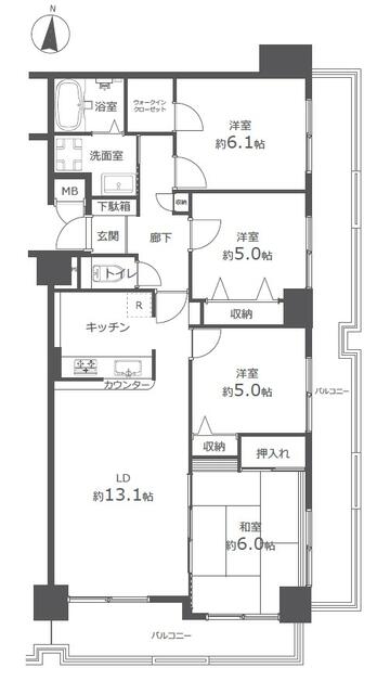 間取り | 4LDK | 間取り内訳 | 和6畳×1室 洋6.1畳×1室 洋5畳×2室 LDK13.1畳×1室 |